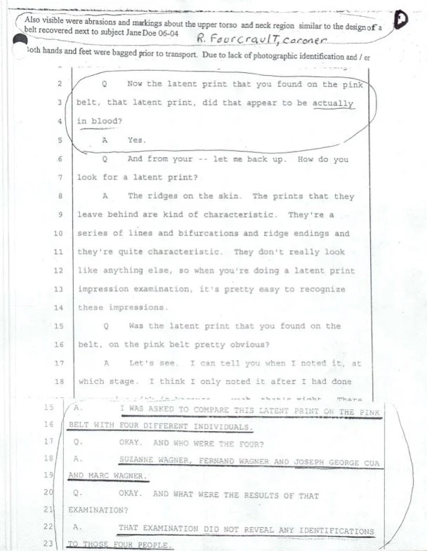 D. Unidentified bloody fingerprint found on Suzanne's belt. R. Fourcraft (coroner)reported abrasions/markings on upper torso and neck region similar to belt found next to Suzanne.